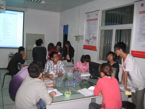 5月4日―6月27日期间,经济与管理系举办的模拟企业管理综合实训在经管系模拟企业综合实训中心顺利进行,本次培训分8期进行,共计培训人数360人,由经济与管理系教师成党伟、张永涛、陈明根、杨瑞明、赵小伟等老师主讲。老师和同学们克服酷热天气,按照公司的安排,利用每天晚上和周末加班加点,圆满完成了这次实训任务。 在沙盘对抗教学模块中,来自经济与管理系会计、建筑经济管理、市场开发与营销、经济信息管理、旅游管理、国土资源管理等不同专业的同学被分为6个小组,每组7-8人,按照企业运作的实际需要分别确定每个人的岗位职能,形成6个相互竞争的虚拟企业,并且要求给企业命名,设计企业的LOGO、广告语等。接着,让每个虚拟企业的CEO介绍了自己的企业概况,并设置了期初状态,通过沙盘教具将企业枯燥的经营数据生动地反映在盘面上,为接下来的仿真经营做好铺垫。在虚拟企业CEO带领下,各“公司”团队运用所学专业知识,在老师的引导下完成“8年”激烈的模拟经营对抗后,老师根据对抗结果给各组同学打分,在对抗中通过各种不同角色的扮演,参与企业融资、营销、生产、财务、人力、投资等一系列经营管理活动,增强了师生对企业运行管理的总体认识和细节把握,充分激发了同学们把课本学习与实践问题的结合,提高了综合管理能力及职业化素质,增强了参与竞争意识,许多问题起到了从理论到实践的质的飞跃。课程授课方式和内容完全打破了传统教学模式,集趣味性、互动性、综合性于一体,充分调动了广大师生的积极性,教学过程中大家情绪高昂,冷静决策,为失败惋惜,为成功喝彩,教学效果极佳。
