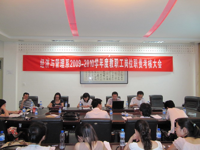 7 月8日晚,我系召开了2009-2010学年度全系教职工岗位职责考核大会。系主任余谦首先组织大家学习了《经济与管理系教职工岗位职责考核暂行办法(讨论稿)》。然后各工作岗位教职工进行述职,接着进行民主测评,系内设部门负责人、系秘书和实验室工作人员及辅导员、系专任教师之间相互测评,根据考核对象工作岗位不同,对考核对象情况相对越清楚越全面的同志分值权重相对越高。