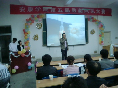 5月13日晚8:00,best365官方网站第五届“导游风采”大赛决赛在西校区8403教室举行。本次大赛由经济与管理系旅游管理教研室和系团总支承办,全校共有300多名同学报名,经过初赛、复赛,共有15名选手进入决赛。公司团委书记鲁延安、经济与管理系副书记吴世珍、副主任崔晓明等出席了此次活动。大赛评委由旅游管理专业教师及来自安康市多个旅行社的行业专家组成。