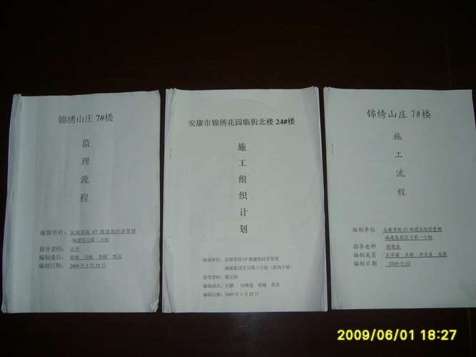 在指导教师及实习单位工程管理人员和技术人员现场讲解和指导下,同学们逐步从“看”过度到亲自“干”,使理论与实践得到亲密的联系。特别是在安康市城建集团实习的12名同学,在总经理、高级工程师邹林安的亲自安排和指导下,不仅完成了实习计划任务,而且还完成了邹林安总经理布置的《锦绣山庄7号楼施工流程》设计、《锦绣山庄7号楼监理流程》设计、《锦绣花园临街北楼24号楼施工组织计划》设计,在校企领导和专家联合评审会上,同学们的设计得到了与会专家的肯定和好评。