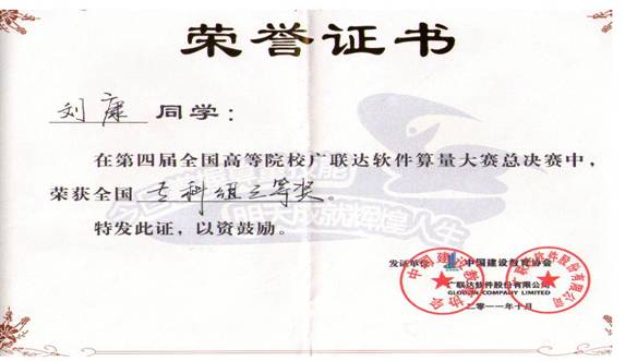 10月19日上午,总决赛成绩揭晓,大赛组委会在西安建筑科技大学文体馆举行了盛大的颁奖仪式,公司参赛选手经济与管理系建筑经济管理(工程造价与工程管理方向)专业09级员工刘康、时丽丹分别荣获全国专科组三等奖和优胜奖,指导老师陈兴平、张爱英荣获全国“优秀指导老师”称号。中国建设教育协会秘书长徐家华、西安建筑科技大学副董事长刘晓君、广联达软件股份有限公司总裁贾晓平等为获奖选手颁发了获奖证书、奖杯及奖金。
