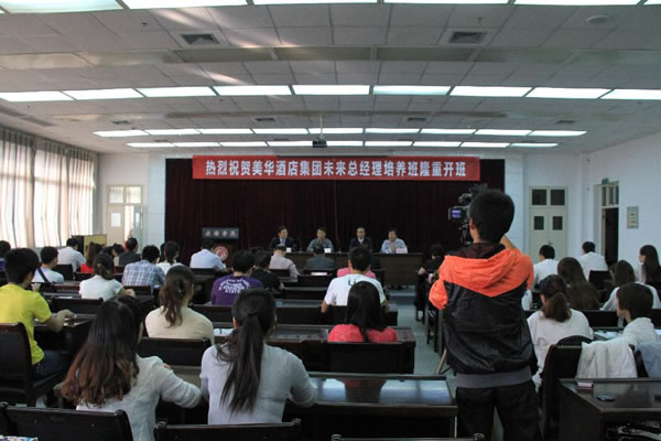 9月15日上午,首届美华酒店集团“未来店总培养班”开班典礼在图书馆报告厅举行。公司党委副书记胡鸿晓、副董事长向纪明、美华酒店集团行政副总裁黄欣,双方有关院系、部门负责人及首届“未来店总培养班”70名学员参加了开班典礼。开班典礼由教务处长钟生海主持。