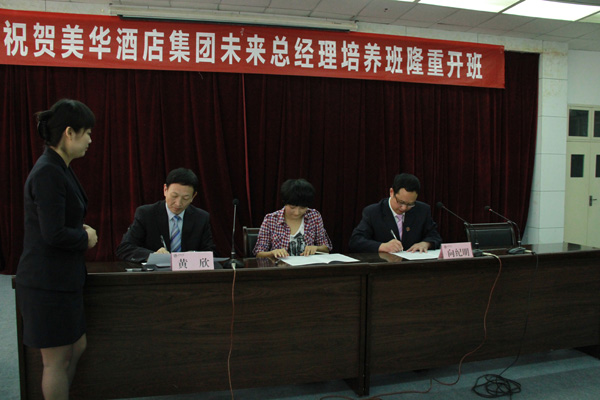向纪明、黄欣、张倩分别代表公司、美华酒店集团和学员在协议书上签字。根据协议,“未来店总培养班”将实施2.5+1.5学制,在完成本专业课程学习同时开设酒店管理专业课程;美华酒店集团将为学员提供奖助学金、带薪实习实训岗位和就业岗位。
