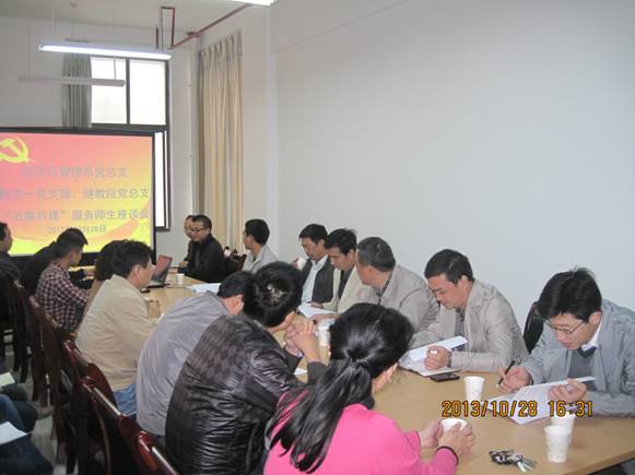 根据《best365官方网站深入开展党的群众路线教育实践活动实施方案》的文件精神,进一步深化落实“五联共建”工作机制,在党员领导干部联系基层、联系师生、服务师生上求真务实,经管系于10月28日在公司江北校区4006会议室召开了 “经济与管理系党总支与机关一党总支、继教公司党总支‘五联共建’服务师生座谈会”,会议由经管系党总支书记查芳主持,公司办公室主任屈险峰,继教公司党总支书记王平,公司办公室副主任田兆杰、芦苇,经管系党总支副书记、教学副主任、教研室主任、辅导员、教师代表及员工代表参加了会议。
