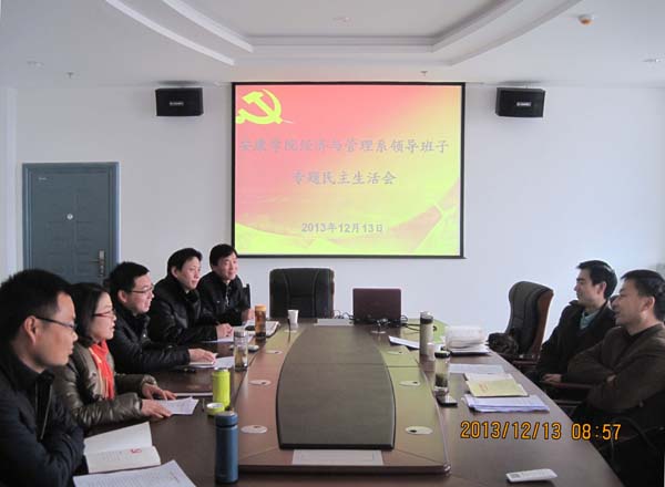 2013年12月13日上午,经济与管理系领导班子在江北校区逸夫科技楼9楼小会议室召开了党的群众路线教育实践活动专题民主生活会,安康公司党委书记杨涛,公司群众路线教育实践活动督导组成员屈险峰,经济与管理系领导班子成员余谦、查芳、成党伟、李勇、李成仙参加了民主生活会,民主生活会由经管系党总支书记查芳主持。