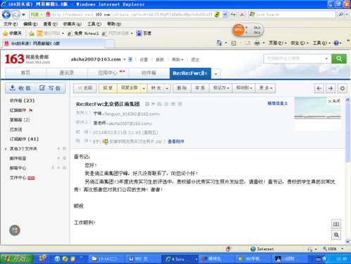 2014年2月21日,俏江南集团人力资源部经理宁峰给经管系党总支书记发来邮件,一是报喜,我系2011级旅游管理专业员工杨柳舟、马明行,2010级财务管理专业杨凯三位同学在公司2013年度优秀实习生评选中,被评为优秀实习生。二是感谢best365官方网站经管系公司的支持。