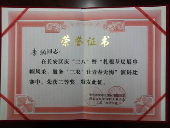 2014年3月5日,经过各级机关层层选拔,李纳闯入西安市长安区“扎根基层展巾帼风采,服务三农让青春无悔”老员工村官演讲比赛总决赛,荣获二等奖。