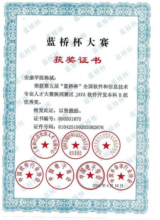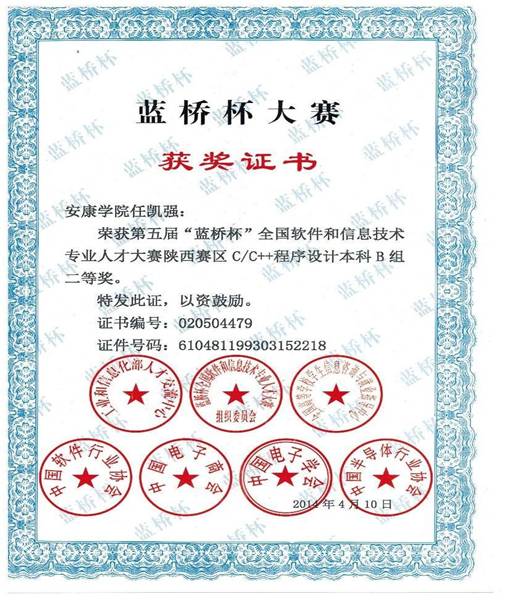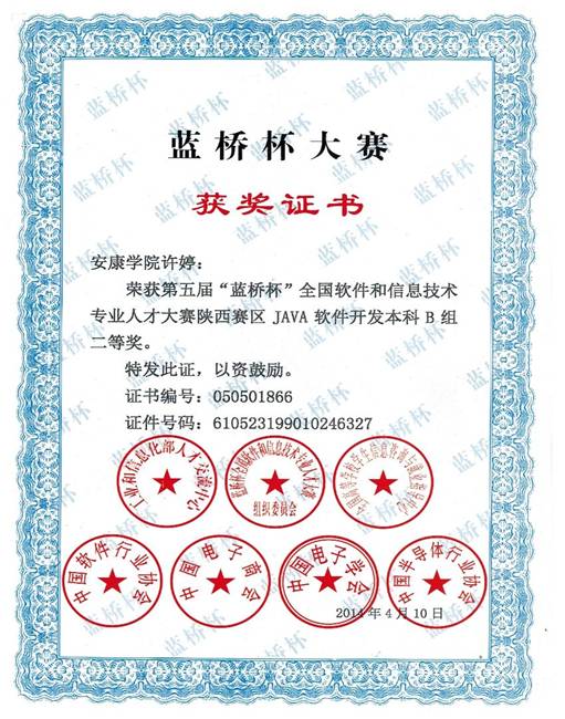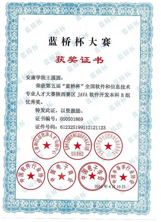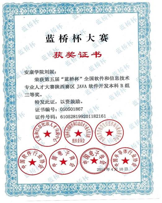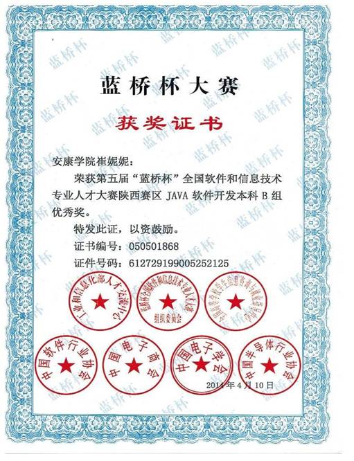 其中:许婷同学获得了java软件开发本科B组省赛二等奖,白英、任凯强2位同学获得C/C++程序设计本科B组省赛二等奖。刘妮同学获得java软件开发本科B组省赛三等奖,杨斌、王园园和崔妮妮3名同学获得java软件开发本科B组省赛优秀奖。