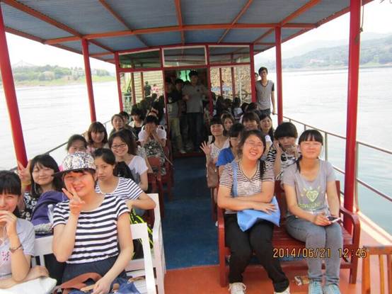 小船轻轻驶过,层层鳞浪随风而起,两岸小岛翠绿欲滴,此情此景,不由得让我们想起了“水光潋滟晴放好,山色空蒙雨亦奇”如此美妙的诗句。徜徉在如此的好山好水之中,13级旅游管理的51位同学似乎融入了山水之间,个个陶醉其中。
