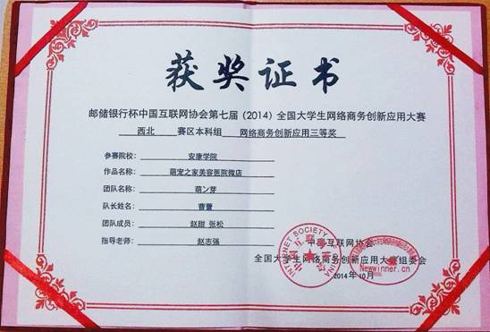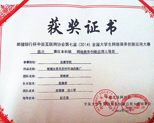 10月21日中午,由工业和信息化部指导、教育部支持、中国互联网协会主办、中国邮政储蓄银行主协办、西安邮电大学承办的全国性老员工互联网公益赛事:“邮储银行杯”中国互联网协会第七届(2014)全国老员工网络商务创新应用大赛西北赛区总决赛在西安邮电大学会议中心圆满落下帷幕。我系12级信息管理与信息系统专业员工曹蕾、商婉君等6名同学在赵志强老师的带领下参赛并取得了良好成绩。其中,由我系赵志强老师指导的“萌芽队”、“商婉君队”分别凭借“萌宠之家美容医院微店”和“邮储业务在农村市场的推广”项目荣获三等奖2项。
