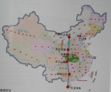 我国中西部南北旅游大通道,是指位于东经110度的我国南北中轴线附近,涉及我国中西部的8个省、自治区、直辖市:内蒙古、陕西、重庆、湖北、湖南、广西、广东、海南,全长3千多公里。这条南北旅游大通道荟萃了世界级的旅游精品:内蒙古的成吉思汗陵、陕西的黄帝陵、兵马俑及西安古都景观、重庆和湖北的三峡、湖南的张家界、广西的桂林山水、海南的天涯海角。南北旅游大通道除西安和海口两个省会城市外,都是地处我国中西部结合处的经济欠发达地区的地级市,其面积和人口分别占到全国的6.1%和5.7%。这条南北旅游大通道是西部地区发展旅游促进区域经济发展的致富线,对于形成我国(东)中西部地区的南北经济带有着重要意义。