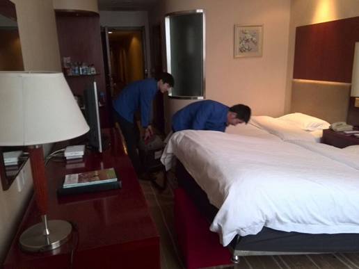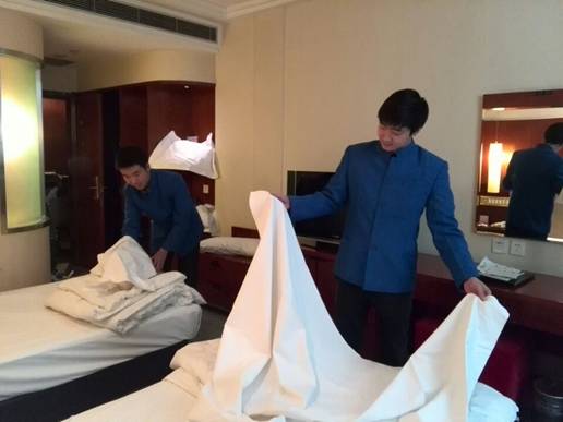 全体员工被分为两组,分别在晶海酒店、金扬宾馆的客房与餐饮部实习。通过真实的工作环境,使员工了解酒店行业,熟悉前厅与客房、餐饮与康乐等部门的工作流程、工作要求与技巧,掌握客房除尘、更换客用物品、中式铺床、清洗卫生间、客人食用菜品的传菜配菜、餐后清理与中、西餐摆台等数项工作。本次实习过程跨越了圣诞、元旦前后,酒店客源多,人口流量大,工作任务重,劳动强度大。但所有同学都能够以认真负责的态度和吃苦耐劳的精神出色的完成实习任务,注重将理论知识与酒店实践相结合,为未来的职业生涯做好准备,并获得酒店方的高度评价。实习达到了预期的效果,并且有部分员工已经在实习岗位进行就业见习。