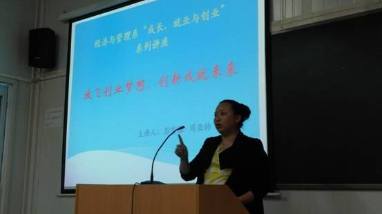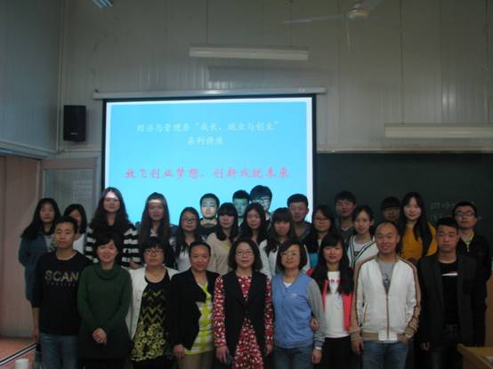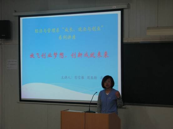 2015年4月18日上午,经济与管理系“成长、就业与创业”系列讲座在江南校区6407教室再次开讲,讲座邀请了安康市本土女企业家彭雪雁女士,公司2007级财务管理专业毕业生、陕西省第五届老员工挑战杯创业计划大赛金奖、国家铜奖得主周亚转和潘云龙学长,为经管系师生作“放飞创业梦想,创新成就未来”的主题讲座。会议由经管系党总支书记查芳教授主持,学工办主任陈钧莹、团总支书记杨朝霞以及数百名员工聆听了讲座。