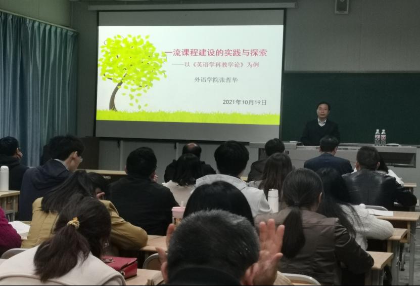 张哲华主要以省级一流课程《英语学科教学论》建设过程及成果为例,从该课程历史沿革、建设实践、建设成效和一流课程建设过程相关情况、体会与思考等几个方面做了详细讲解。强调了金课建设团队的重要性,校内校外名师合作的重要意义以及积极申报各类教改项目的促进与积累作用。从教改示范课、考改课、混改课、双师课、省级线上课等多个方面的建设过程深入分析了建设好教学团队、搞好教学改革、成果积累和经验总结等一系列成功经验。