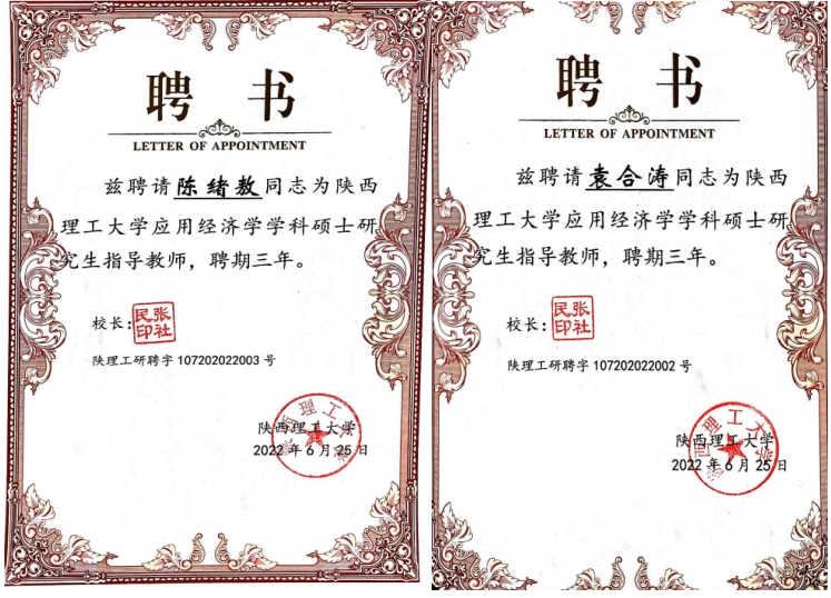 近日,从陕西理工大学《关于公布2022年新增硕士研究生导师遴选结果的通知》陕理工校发〔2022〕63 号文件获悉,公司陈绪敖教授和袁合涛副教授被陕西理工大学聘为应用经济学学科硕士研究生指导教师,聘期3年。