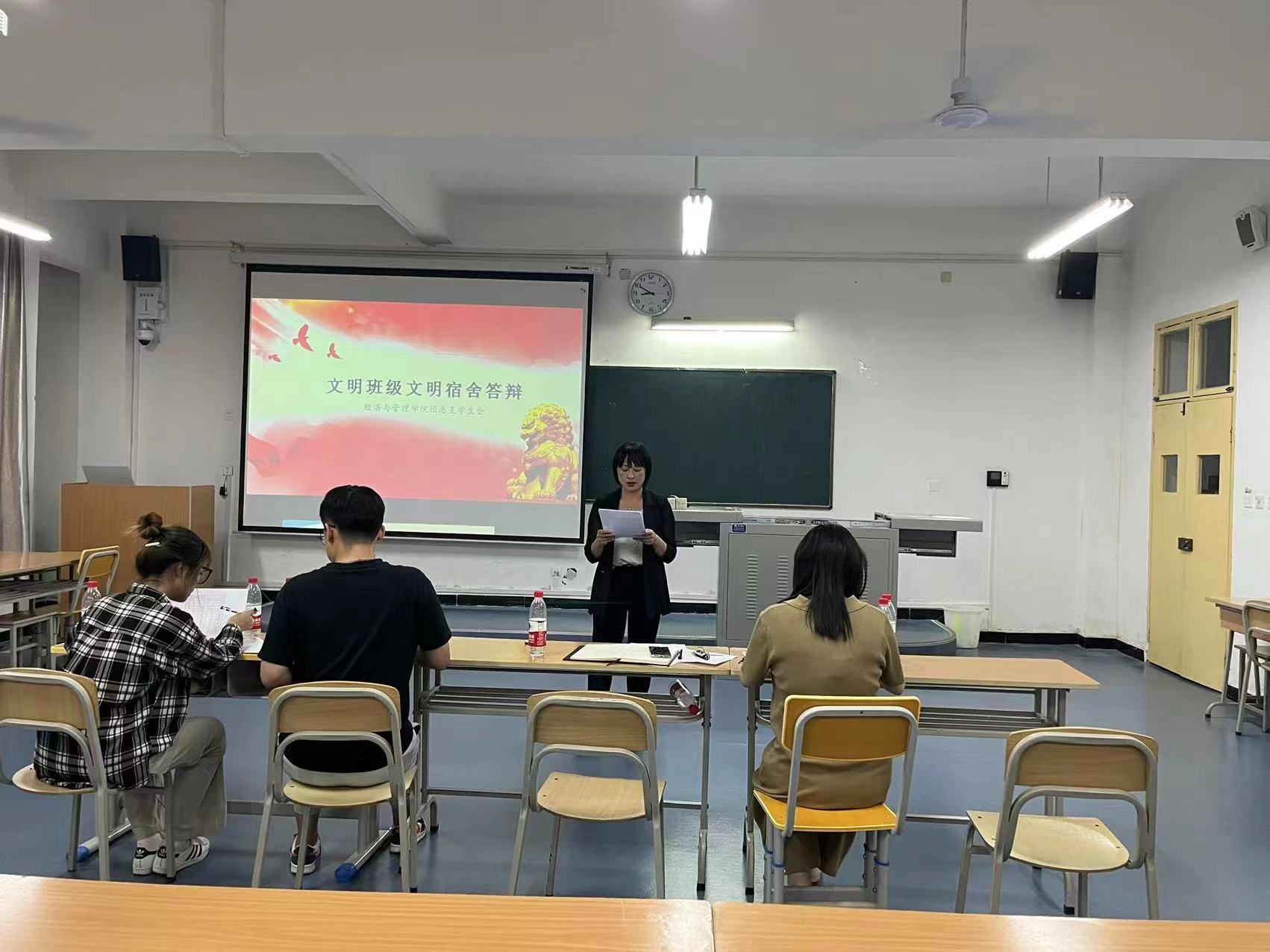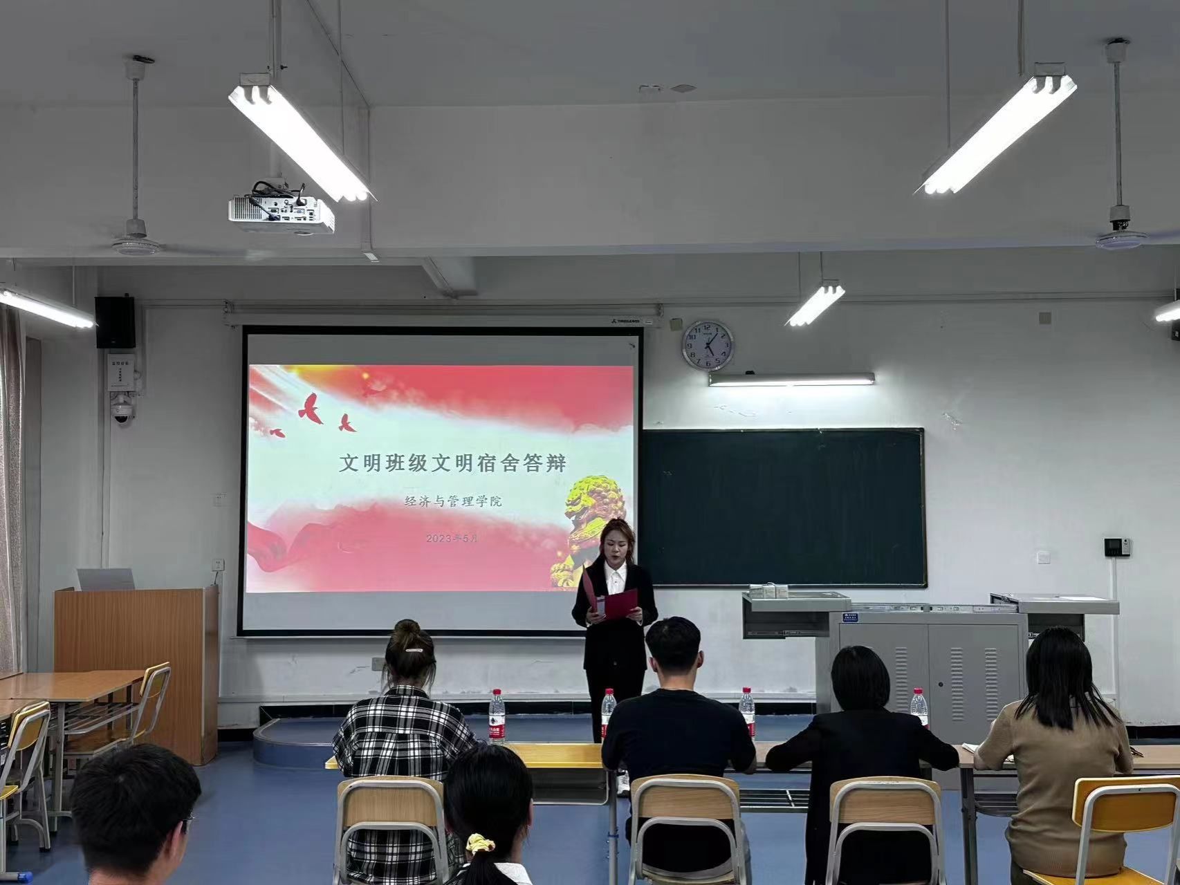 答辩现场,7个参评班级依次登台,图文并茂地介绍了各自班级在班风学风建设、班级文化建设、宿舍建设、第二课堂等方面开展的工作和取得的成绩,展现出了各班良好的精神风貌。