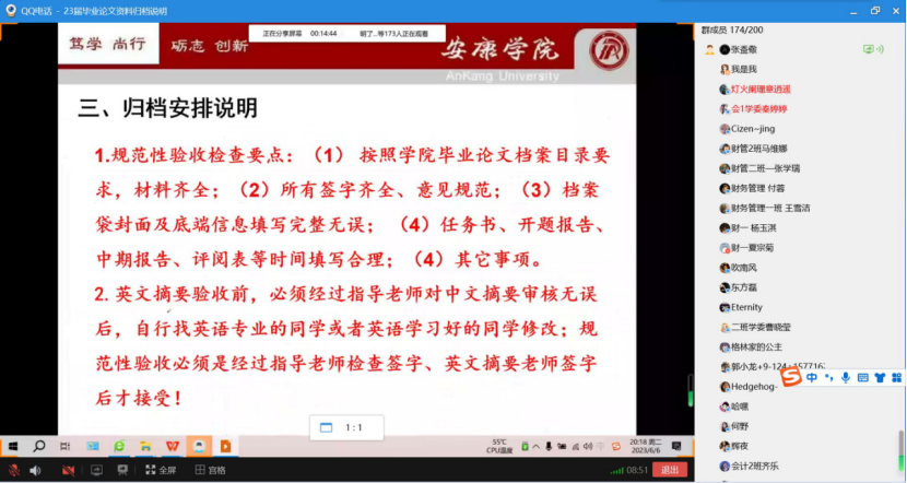为了确保2023届毕业论文归档工作的顺利开展,使员工明确论文资料归档各个环节的工作要求,提高毕业论文检查验收的质量和效率,公司财会系于6月6日晚通过QQ直播形式面向财会系全体毕业班同学召开毕业论文资料归档说明会。会议由财会系主任王奕主持。