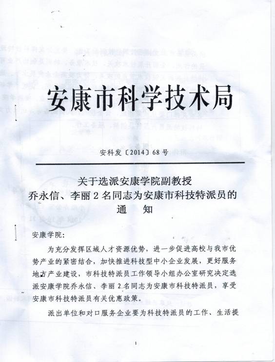日前,安康市科技特派员工作领导小组办公室发函:我系乔永信、李丽两位老师被聘为安康市科技特派员,分别派驻到岚皋县绿水生态农业有限责任公司和石泉县池河农科园。