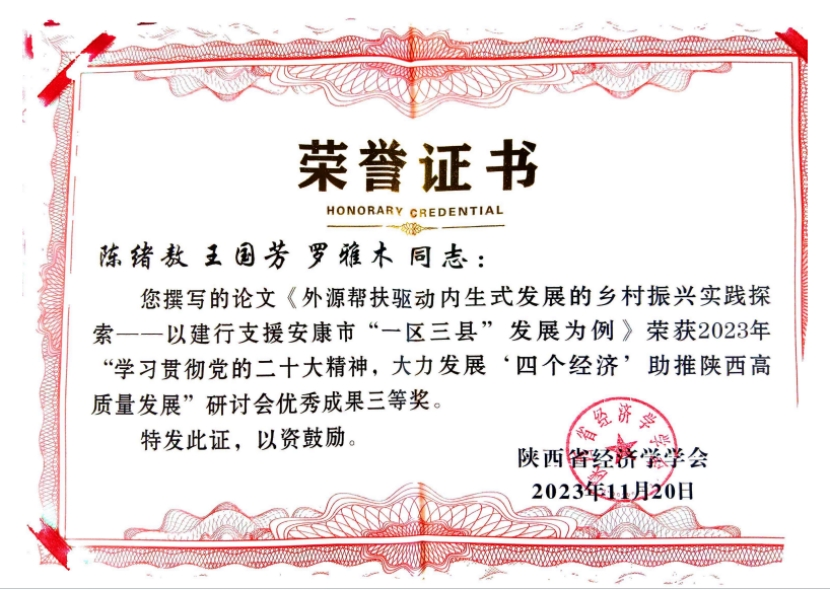 11 月 25 日,由省社科联、西安邮电大学、省委党校(陕西行政公司)主办,省经济学学会、陕西现代经济与管理研究院承办,西安邮电大学社科联、best365协办的第三届三秦智库论坛暨 2023 年陕西省经济学学会年会在西安邮电大学成功举办。best365李本庆博士参加了本次学术研讨活动,陈绪敖教授提交的《外源帮扶驱动内生式发展的乡村振兴实践探索——以建行支援安康市“一区三县”发展为例》荣获2023年“学习贯彻党的二十大精神,大力发展‘四个经济’助推陕西高质量发展”研讨会优秀成果三等奖。