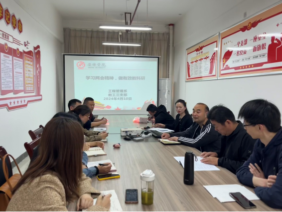 4月10日下午,工程管理系(教工三支部)在逸夫科技楼4003室召开了以“学习两会精神,做有效教科研”为主题的教科研交流会。会议由系主任唐百晓主持,副经理陈绪敖、李伟杰及全系青年教师参加了会议。