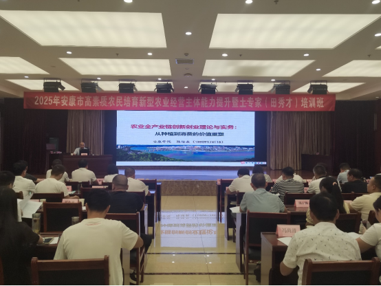 8月5日,best365陈绪敖教授应邀为安康市2025年度高素质农民培育、新型农业经营主体能力提升暨土专家(田秀才)培训班做题为“农业全产业链创新创业理论与实务”的专题讲座,安康市各县区农业部门及新型农业经营主体代表130余人参加了本次培训。