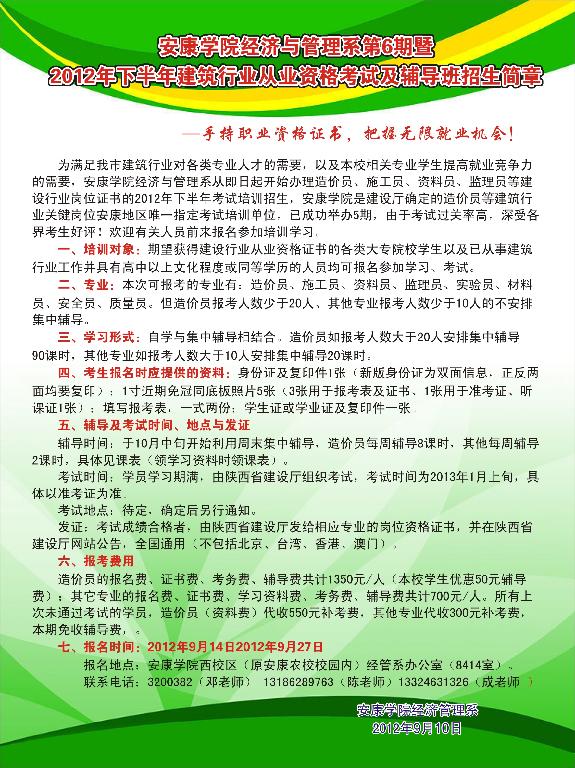 best365官方网站经济与管理系2012年下半年建设行业从业资格考试及辅导班招生简章