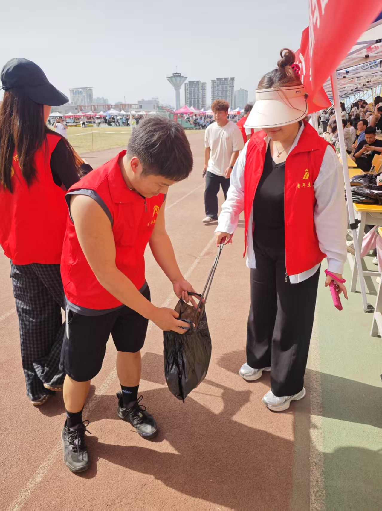 运动会期间,党员志愿者们早早抵达现场,投身到紧张的筹备工作中。“请有序排队领取号码布”“前方设有免费饮水点”“我扶您到前面运动员休息区”......志愿者们分工明确、配合默契,有的负责布置看台,张贴横幅标识;有的在帐篷点做好参赛人员信息登记工作,确保比赛有序进行;有的专注于操场内外垃圾的清扫和秩序维护,确保赛事所需一应俱全。尽管脚步匆忙,但现场秩序井然,每一个环节都凝聚着志愿者们的用心与责任感。他们以高效的行动为运动会的顺利进行做好服务保障。