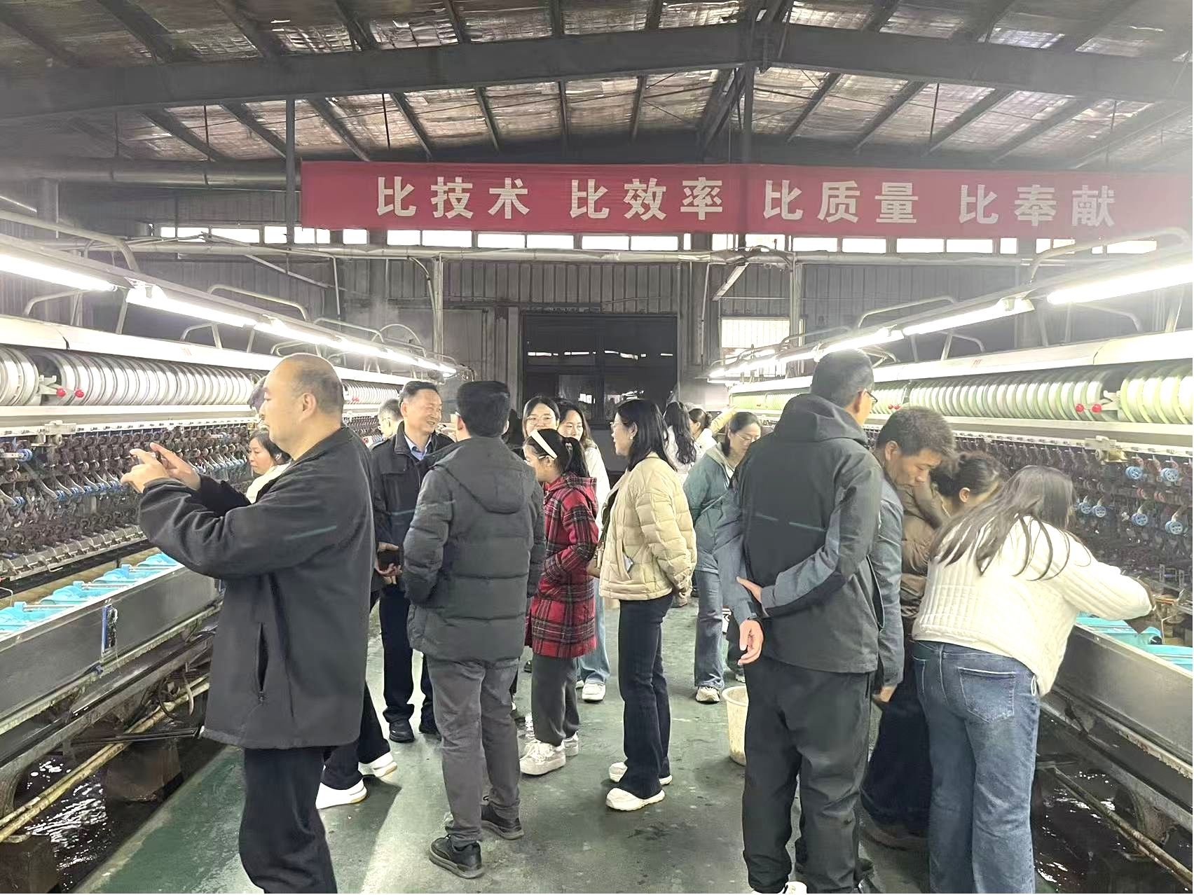 在鎏金蚕丝绸有限公司,从蚕茧筛选、缫丝到织造、成品制作的完整产业链条清晰地呈现在眼前,使教师们对传统丝绸产业的现代化转型有了直观认识。考察过程中,公司教师与企业负责人及技术骨干就传统产业如何借助科技实现转型升级、区域品牌如何打造与推广、高校如何更精准地对接企业需求进行人才培养与科研合作等议题,进行了广泛而深入的交流探讨。