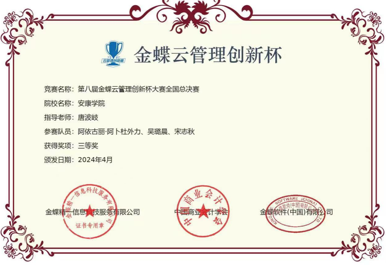 第八届金蝶云管理创新杯大赛全国总决赛三等奖