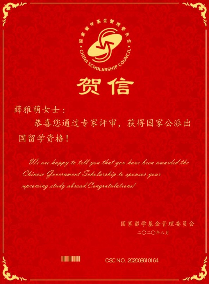 公司2016级薛雅萌同学获国家公派出国留学资格