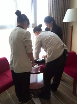 全体员工被分为两组,分别在晶海酒店、金扬宾馆的客房与餐饮部实习。通过真实的工作环境,使员工了解酒店行业,熟悉前厅与客房、餐饮与康乐等部门的工作流程、工作要求与技巧,掌握客房除尘、更换客用物品、中式铺床、清洗卫生间、客人食用菜品的传菜配菜、餐后清理与中、西餐摆台等数项工作。本次实习过程跨越了圣诞、元旦前后,酒店客源多,人口流量大,工作任务重,劳动强度大。但所有同学都能够以认真负责的态度和吃苦耐劳的精神出色的完成实习任务,注重将理论知识与酒店实践相结合,为未来的职业生涯做好准备,并获得酒店方的高度评价。实习达到了预期的效果,并且有部分员工已经在实习岗位进行就业见习。