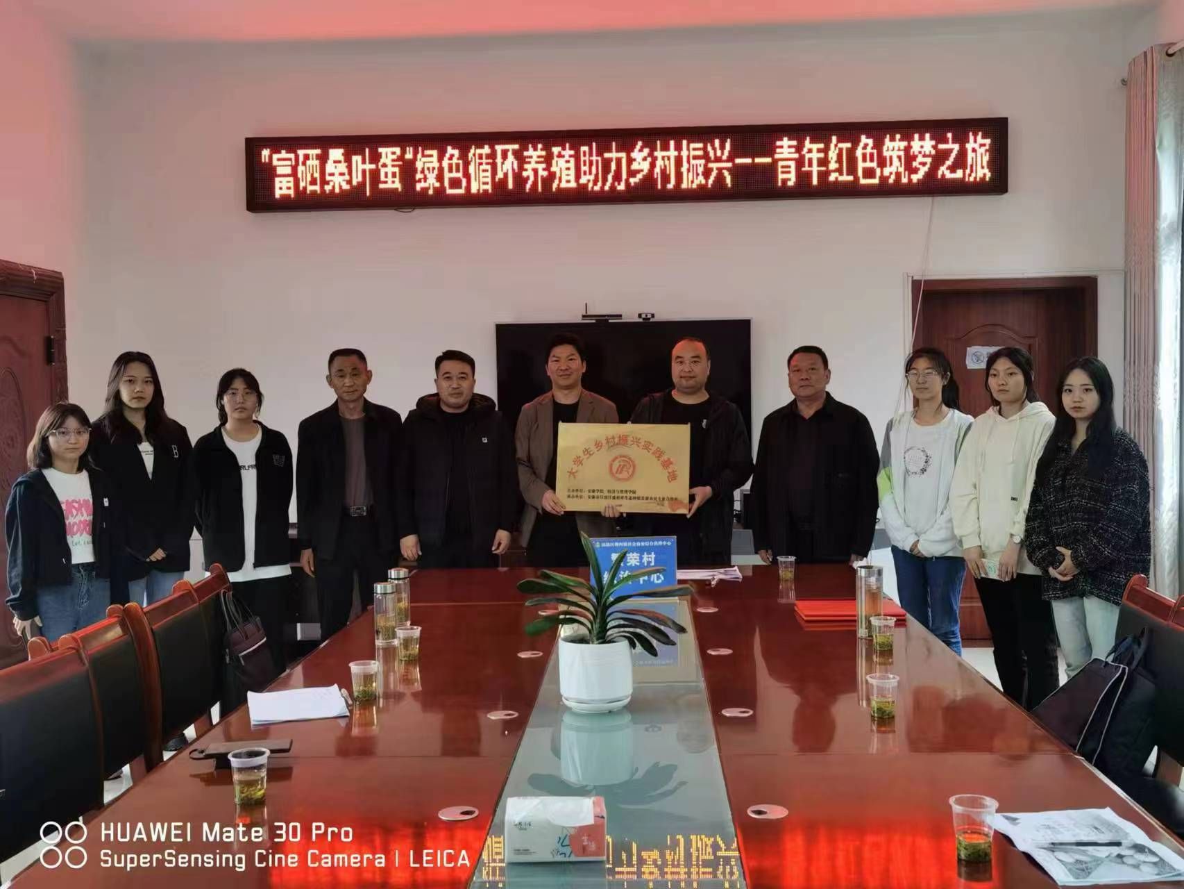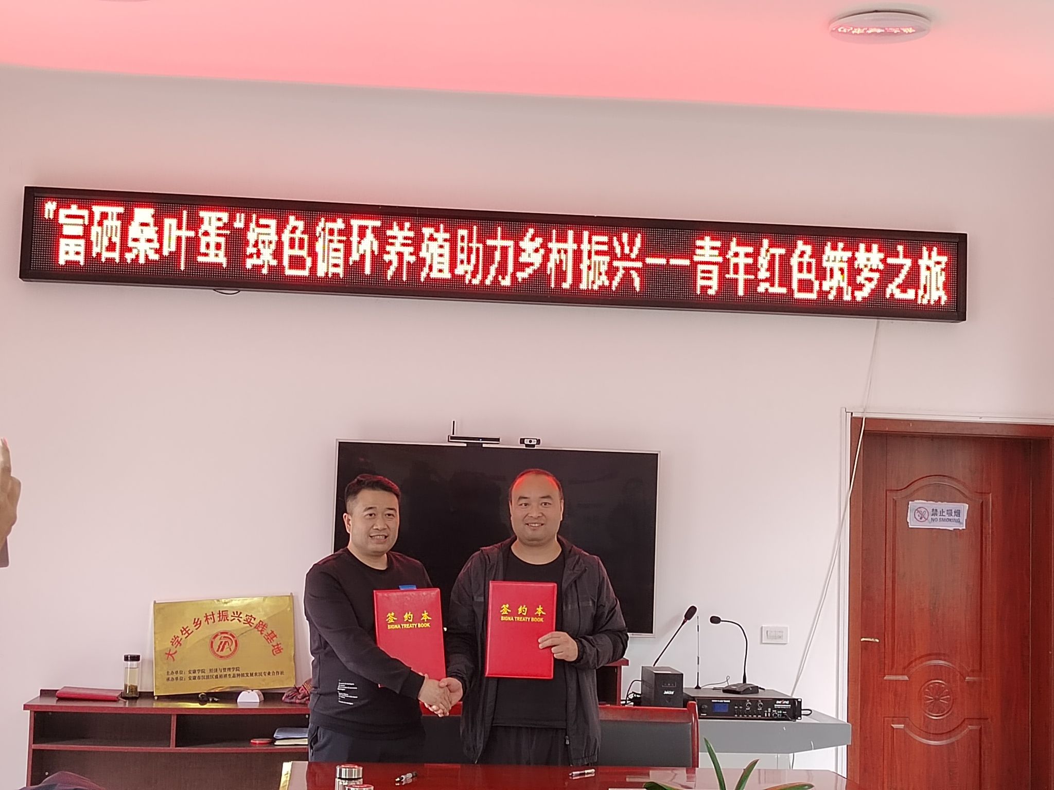 随后,校企双方召开座谈会,共同就“富硒桑叶蛋”绿色循环养殖助力乡村振兴项目——青年红色筑梦之旅活动进行深入探讨。陈绪敖、柯愈鑫代表校企双方签订有关“老员工研学”合作协议。坝河镇党委书记鲁波为 “老员工乡村振兴实践基地”授牌。