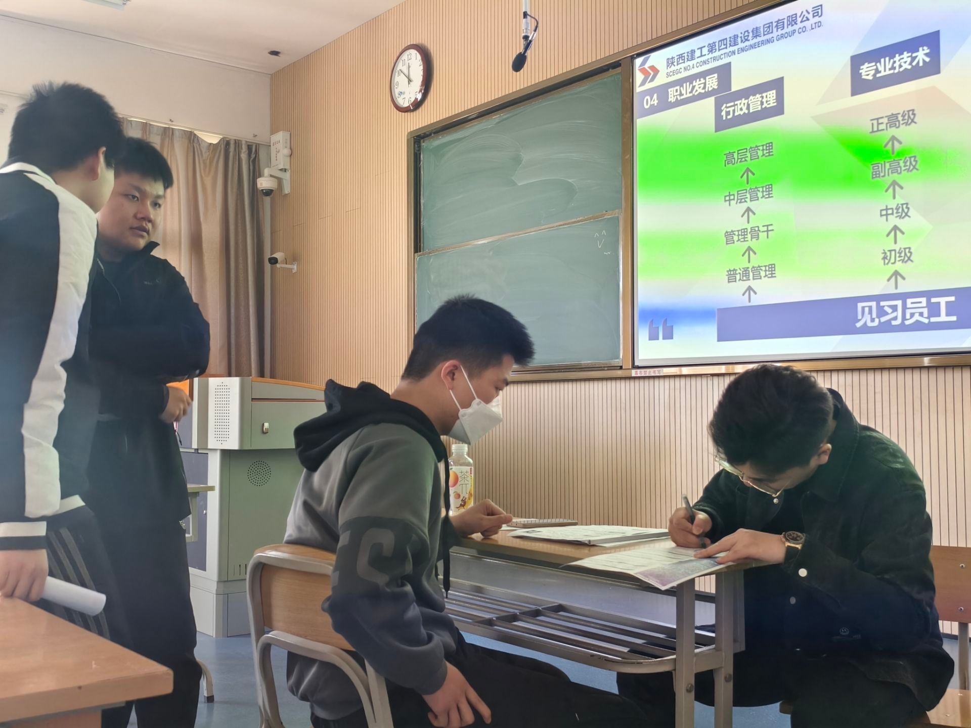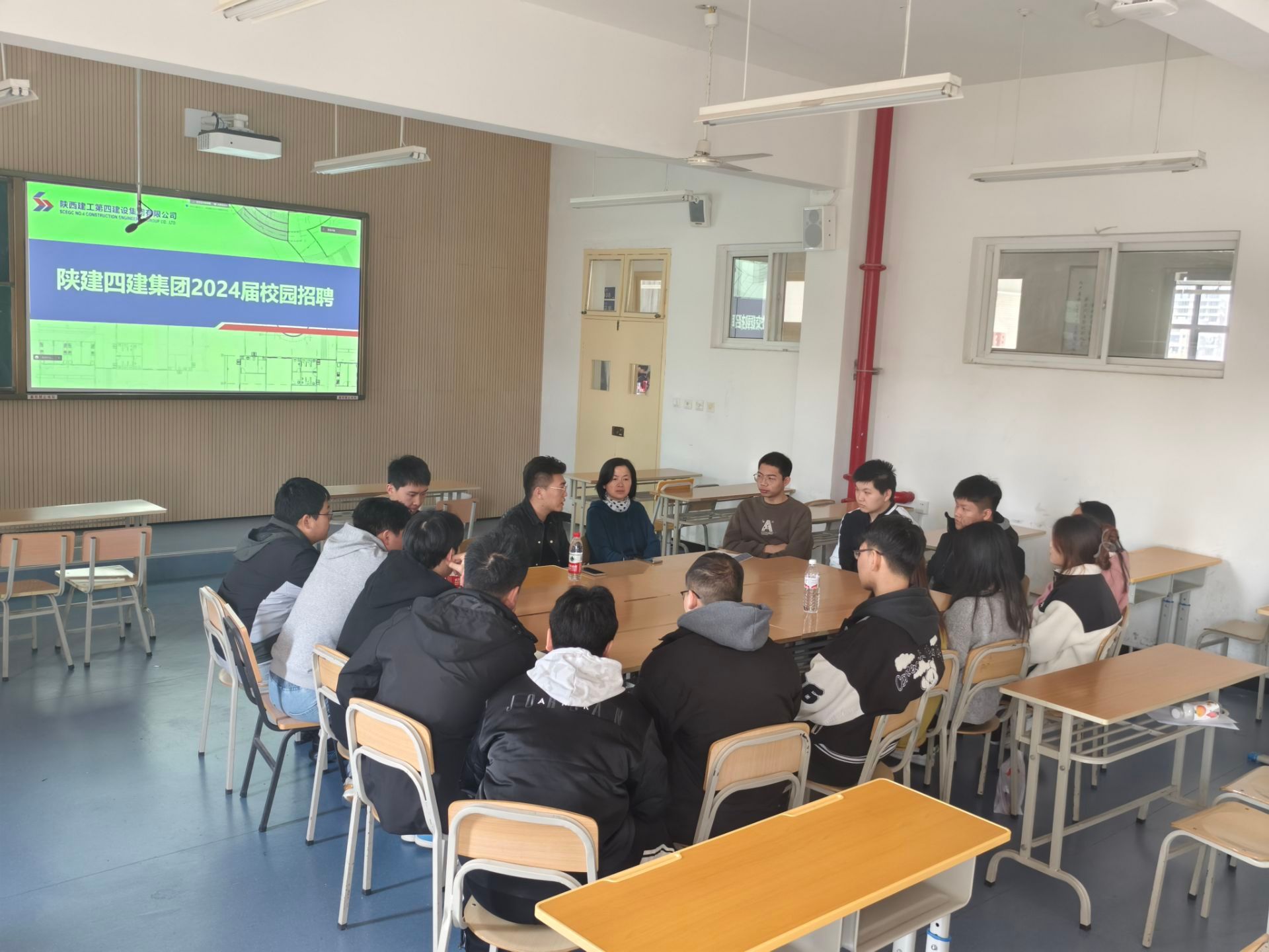 3月25日下午,陕西建工第四建设集团来公司开展专场招聘,公司辅导员陈钧莹、24届毕业生和部分大三员工参加了本次招聘会。