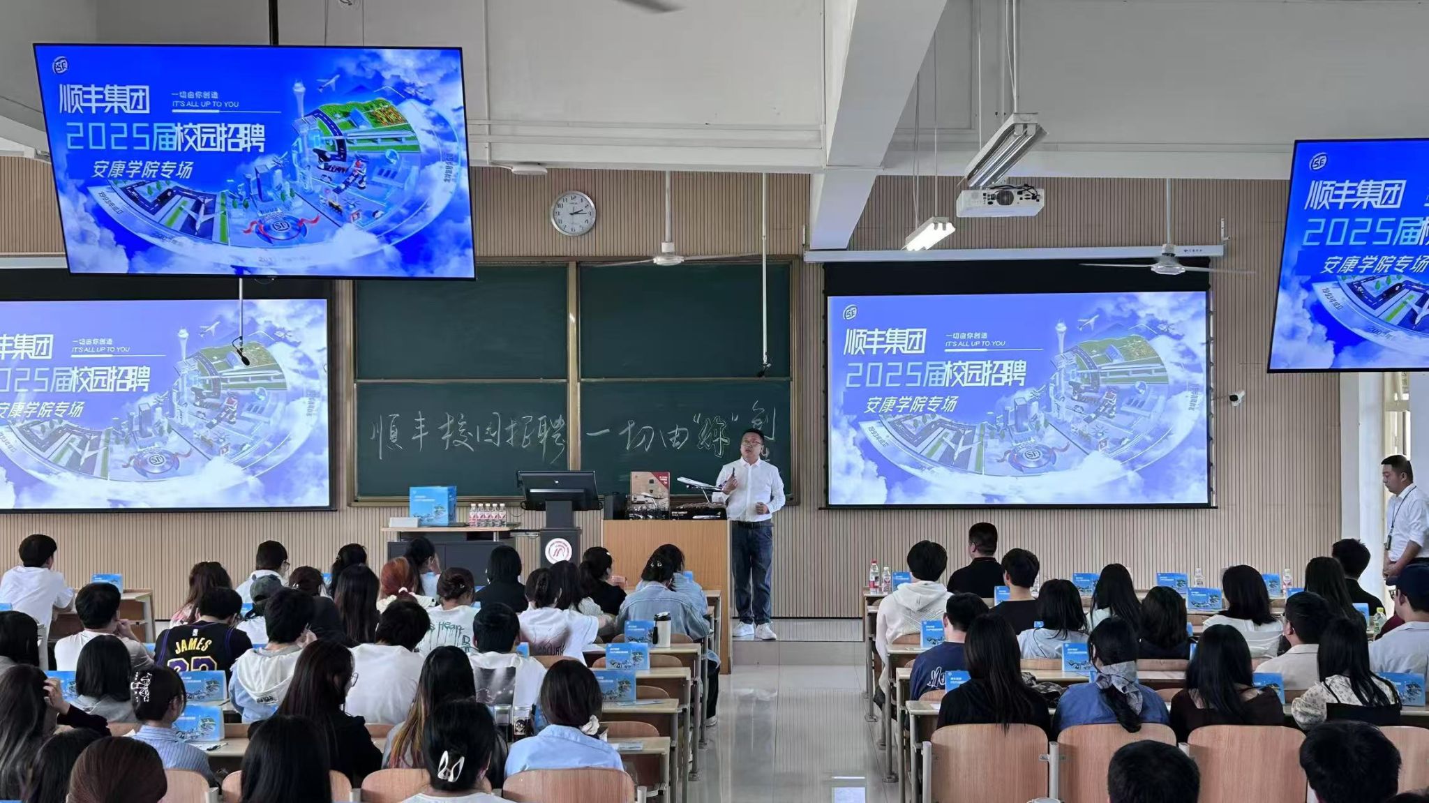 招聘会伊始,顺丰陕西区人力资源部总监刘俊文围绕企业文化、职业发展路径、工作内容及福利待遇等毕业生重点关注的方面,进行了全面且细致的介绍,并通过抽奖环节活跃了现场氛围。随后,顺丰陕西分公司人力资源部招聘经理强鲁苗向同学们详细介绍了校招流程、时间安排,着重介绍了面向本科生的“新鹰计划”以及针对应届毕业生的“优才计划”等项目,帮助同学们清晰了解岗位需求与发展前景。最后,20名2025届应届毕业生在1405教室进行了现场面试。