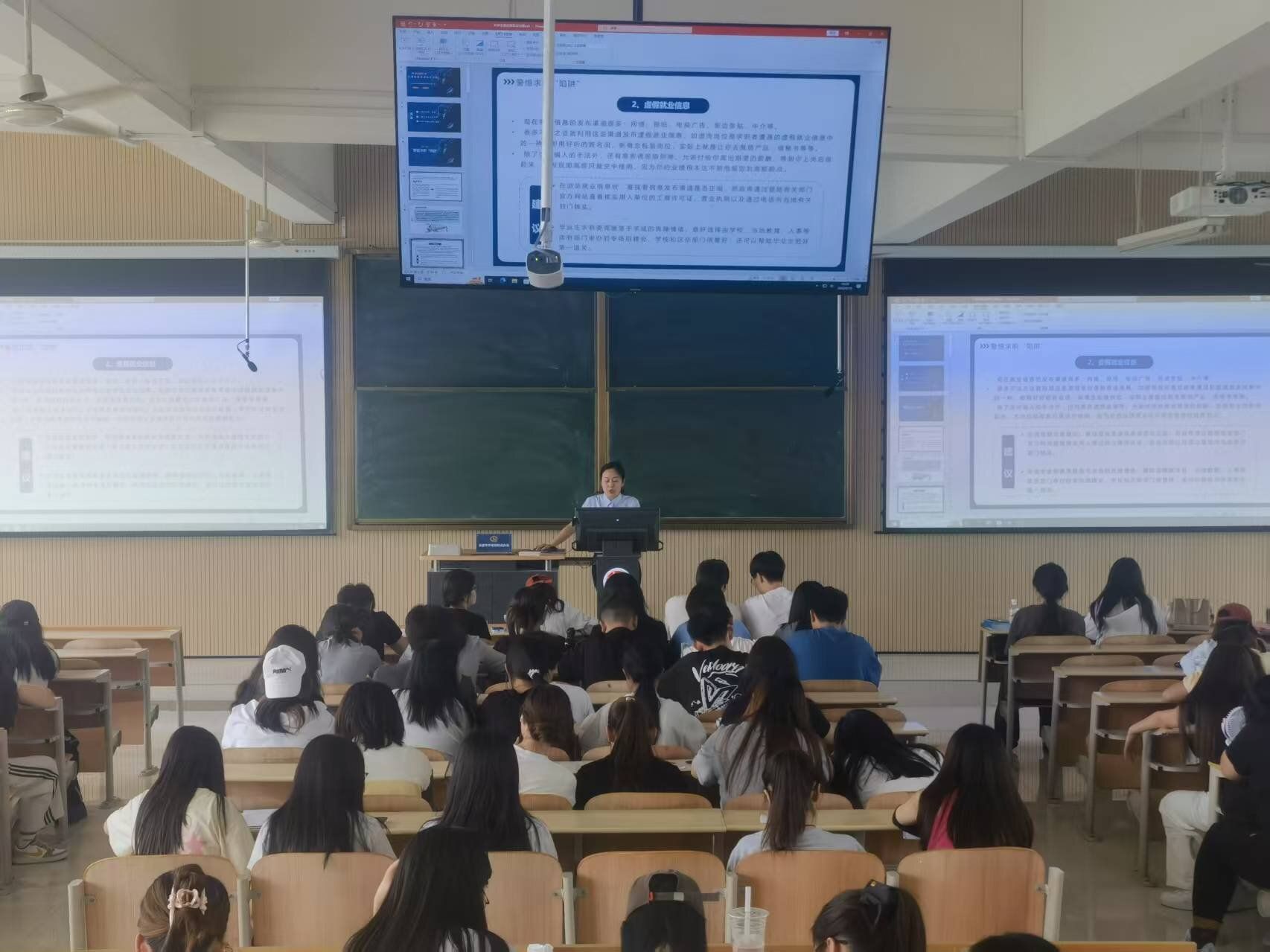 第二场老员工就业指导与法律宣传讲座则聚焦老员工就业过程中的实际问题。主讲人结合当下就业形势,列举了老员工常见的求职“陷阱”,如虚假招聘信息、试用期侵权、劳动合同霸王条款等。通过真实案例分析,生动展现这些“陷阱”的危害,并提供了切实可行的就业安全应对策略。同时,深入讲解就业相关法律法规,指导老员工了解自身就业权益,学会运用法律武器维护合法权益,为同学们未来求职就业筑牢法律防线。