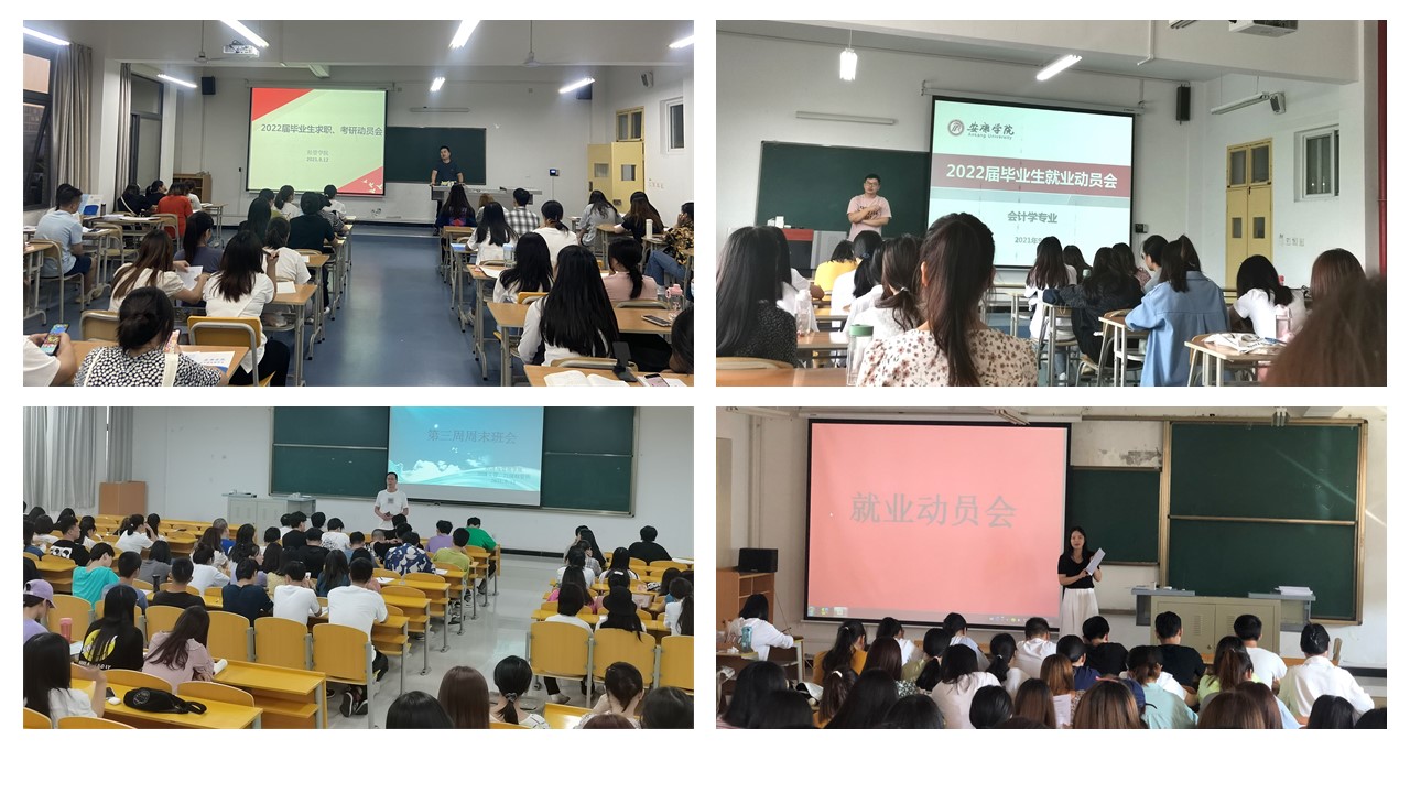 在考研动员会上,老师们从考研复习进度安排、考研院校选择、考研心理调适等方面进行讲解,鼓励大家克服困难、坚定信心、高效学习,按照既定目标,勉励考研员工考取心仪的公司;在求职动员会上,老师们从职业生涯规划、就业形势、就业政策等方面进行解读,指导员工树立正确的就业观念,勉励大家要树立“先就业,再择业”的成长理念,克服求职压力,建设积极心理,把握机会,在工作岗位中提升能力、磨练本领;在实习动员会上,老师们进行安全和纪律教育,对于毕业实习工作进行了讲解和安排,鼓励全体毕业生积极联络就业单位,按时完成实习任务,同时注意防疫安全、人身安全、财产安全,常态化同老师、同学和家长联系。