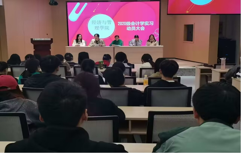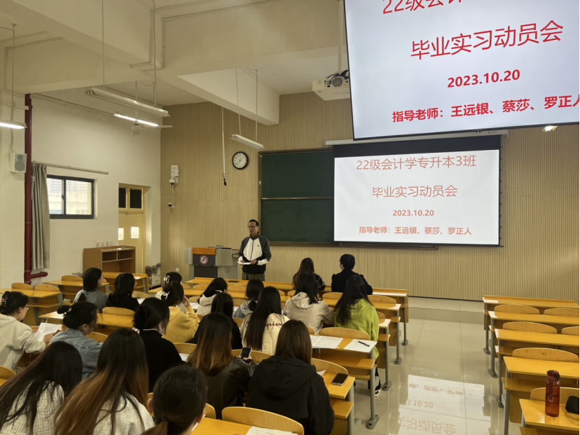 为进一步提高毕业实习质量,要做到有落实单位、有安全保障、有执行质量,按照公司及公司相关工作安排,公司分别于10月18日、10月19日、10月20日组织召开会计学20级、会计学专升本21级六个班级的毕业实习动员大会,相关专业指导老师及陈钧莹、王远银两位辅导员参加动员大会。