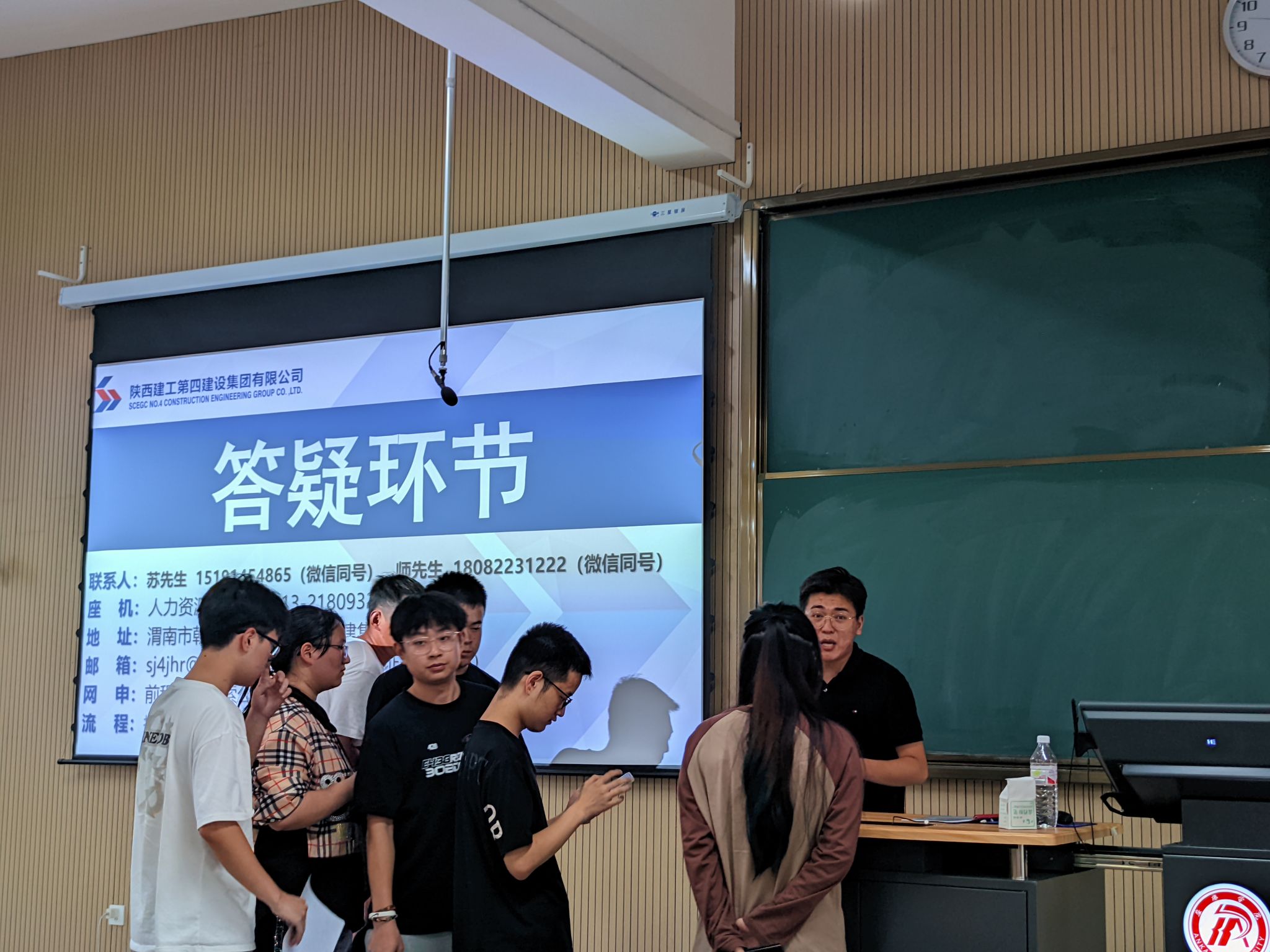 宣讲会伊始,公司毕业生辅导员陈钧莹对陕建工第四集团公司的到来表示欢迎,向现场同学分析了当前行业发展趋势及就业形势,介绍了近几年企业在公司招聘情况及双方校企合作情况。陕西建工第四建设集团招聘人员师俊平通过播放公司宣传片和讲解ppt等形式从公司概况、企业文化、招聘岗位、工作环境等方面向同学们进行了讲解,让同学们对公司有了初步了解和认识。期间,现场同学针对自身较为关心的行业发展趋势、未来职业规划、薪酬福利待遇等问题积极发言提问,公司工作人员一一给出了详细解答。