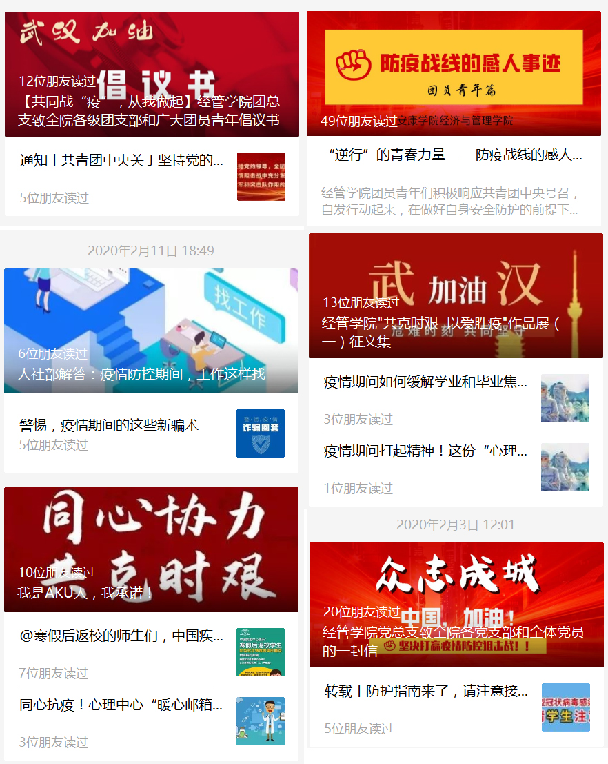 党有号召,团有行动,当好疫情防控工作的“宣传员”。2月1日,团总支发布了《best365团总支致全院各级团支部和广大团员青年倡议书》,倡导各级团干部、广大团员青年要立即行动起来,深入贯彻落实习近平总书记重要指示和党中央、国务院决策部署,落实公司、公司工作要求,响应上级团组织号召,有序参与防控工作,为坚决遏制疫情扩散、夺取防控斗争胜利贡献青春力量!