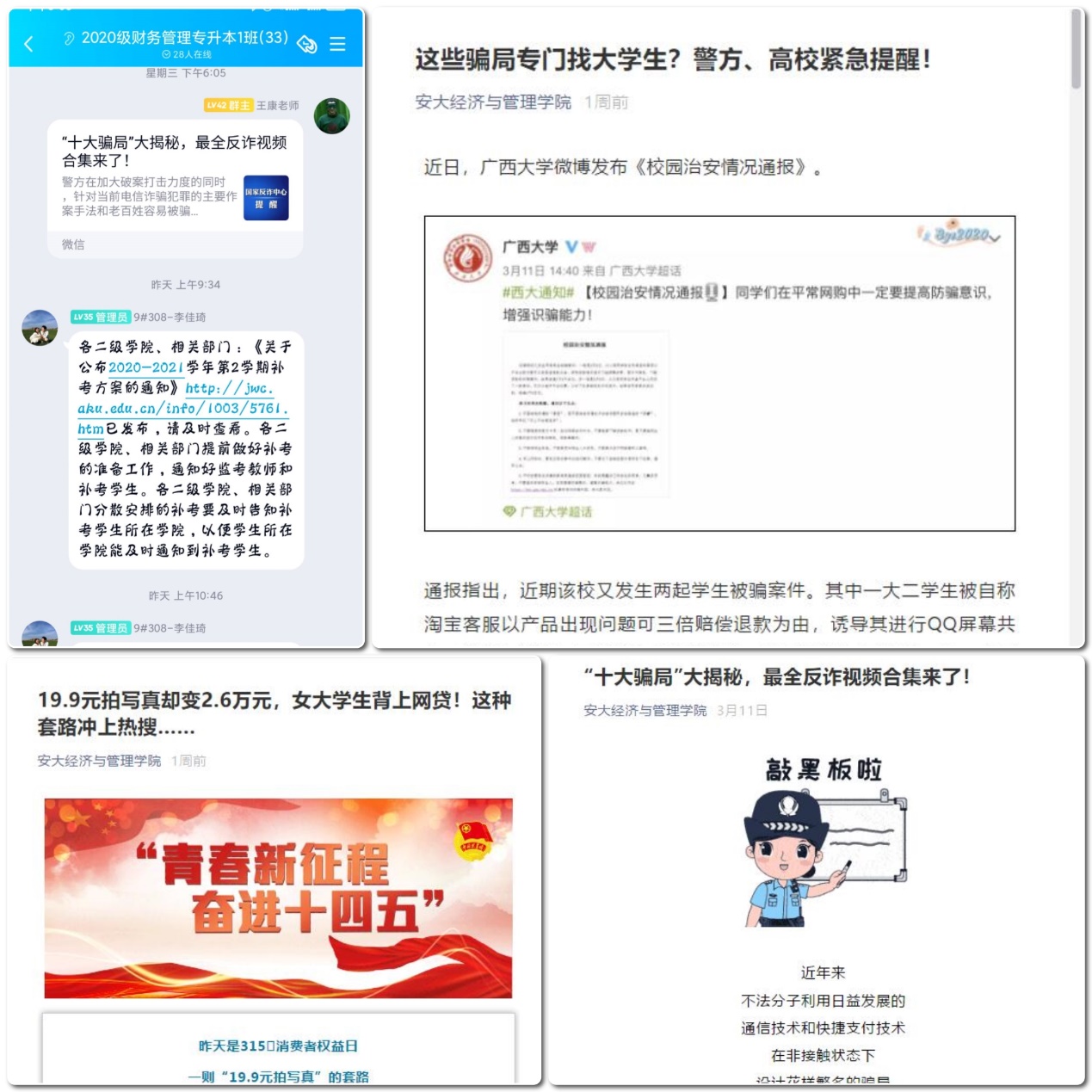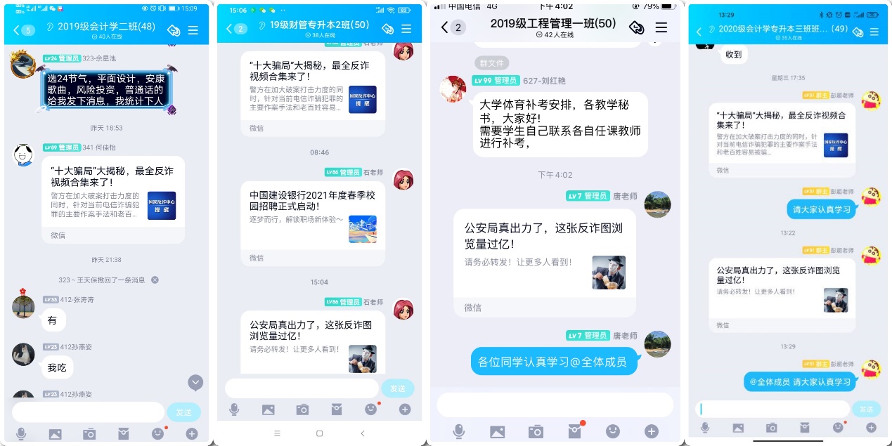 基于现有网络平台资源,公司通过微信公众号、班级微信群、QQ群等方式开展了面向全院员工的防范电信诈骗线上主题教育。