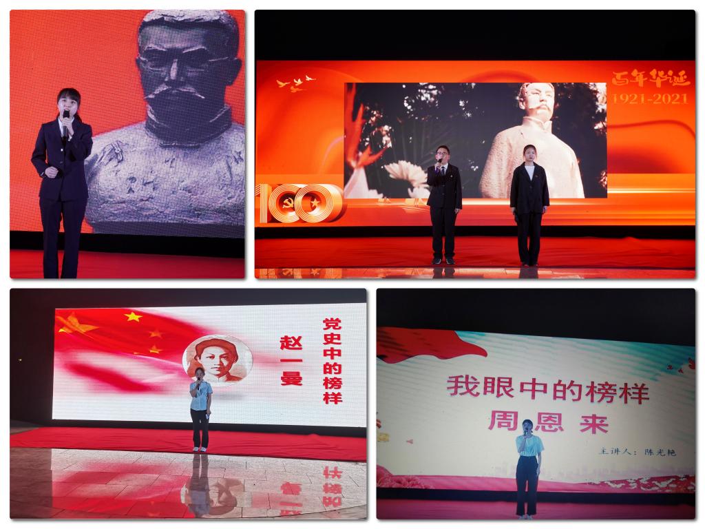 员工榜样欧阳心盈、张弛、牛佳彤、陈光艳、李晓芝分别声情并茂地讲述了党史中的榜样李大钊、周恩来、赵一曼等人的光辉事迹,号召广大青年学子不忘历史,不忘英雄,在榜样中汲取力量,以更加强烈的使命担当,把个人的奋斗融入国家富强、民族振兴的历史进程中,为实现中华民族伟大复兴贡献智慧和力量。