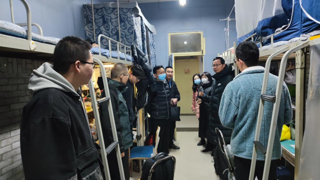在宿舍里,李成仙详细询问宿舍成员的返校情况,了解暂未返校员工的情况,嘱咐已返校的员工与他们保持联系,遇到困难及时和公司联系。遇到部分上学期有不及格课程的员工,他提醒员工要抓住补考前的时间,认真复习,亡羊补牢。