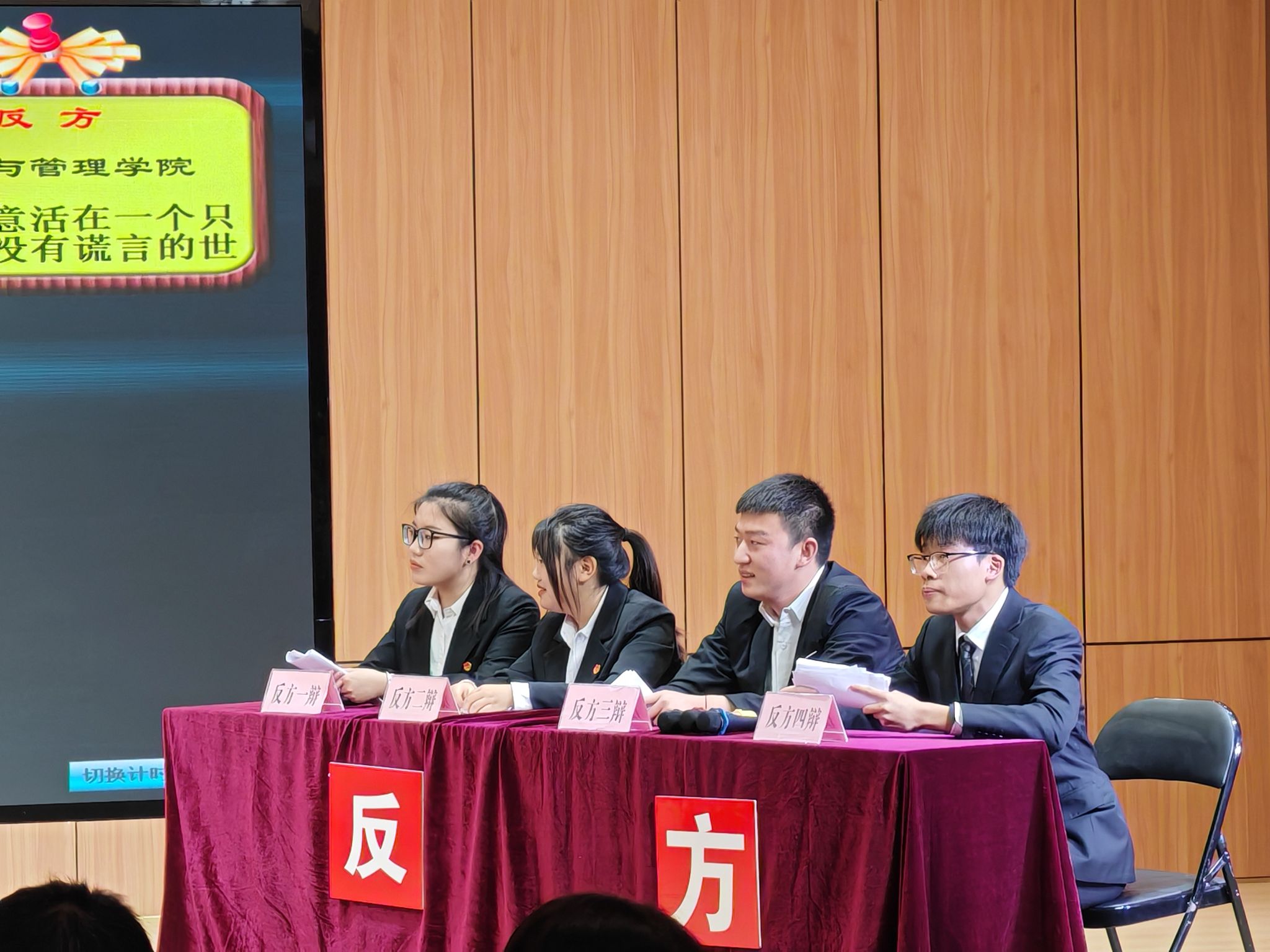 本次比赛全校共有12支队伍参与角逐,经过前期的初赛和复活赛,公司辩论队以两胜一负的成绩惊险出线。进入复赛后,公司辩论队稳扎稳打,顺利晋级四强。半决赛中,公司辩论队更是凭借成熟的辩论技巧与团队默契挺进决赛。在决赛赛场上围绕“我是否愿意活在一个只有真话没有谎言的世界”辩论主题展开激烈交锋,最终,公司辩论队以扎实的理论基础和缜密的逻辑思维战胜对手赢得冠军,历时一个多月,为此次比赛画上了圆满句号。