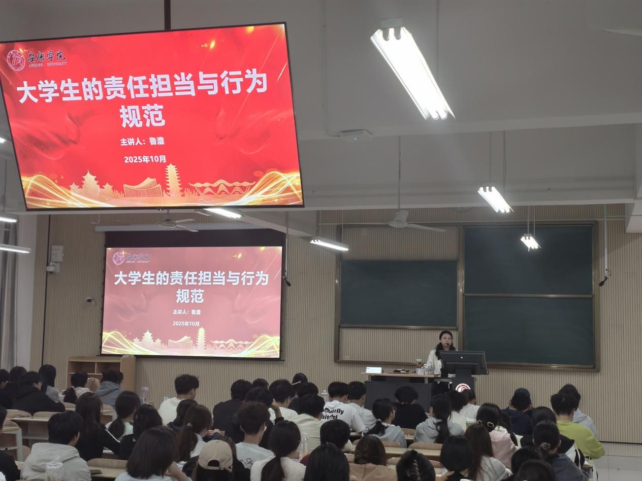 2025年10月14日晚上19点,江北校区1号教学楼1301教室座无虚席,全体新生齐聚于此,认真聆听由公司党总支副书记鲁澧主讲的入学教育第五讲——“老员工的责任担当与行为规范”专题讲座。