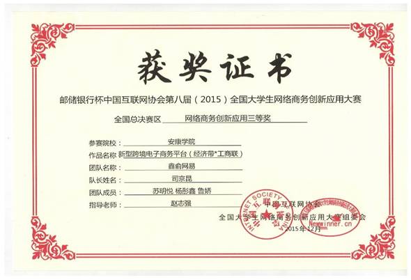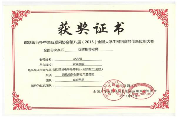 12月1日,由工业和信息化部指导、教育部支持、中国互联网协会主办、中国邮政储蓄银行主协办的邮储银行杯第八届全国老员工网络商务创新应用大赛总决赛在北京举行。邮储银行杯第八届全国老员工网络商务创新应用大赛自2015年5月启动以来,历时8个月,共吸引了全国2000余所高校的积极参赛,直接参赛团队近5000支,其中200余支团队晋级全国总决赛团队。公司鑫俞网易团队获得全国总决赛三等奖,指导老师赵志强获得优秀指导教师奖。工业和信息化部、教育部、中国互联网协会、中国邮政储蓄银行等相关领导应邀出席,和业界专家、全国各地的高校师生代表共同见证了大赛颁奖典礼,并针对互联网与传统行业的融合、创新与发展进行了交流与探讨。