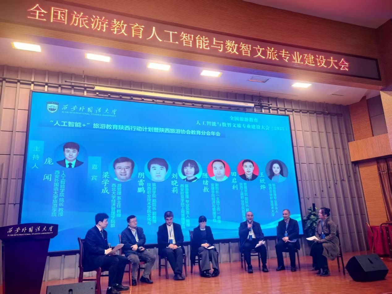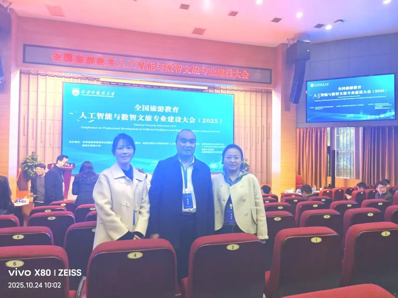 10月24-25日,全国旅游教育人工智能与数智文旅专业建设大会在西安外国语大学长安校区举行。大会以“人工智能重塑旅游教育新生态”为主题,汇聚三十余位专家学者,围绕聚焦政策传达、旅游专业转型、数智文旅专业及微专业试点申报、人才培养经验交流等核心议题,展开专题分享与现场研讨,共同探索人工智能赋能旅游教育的创新发展模式。best365作为陕西省旅游协会教育分会常任副理事会员单位,副经理陈绪敖教授、实验室副主任迟超楠及旅游管理专业教师朱妮参加了本次会议。