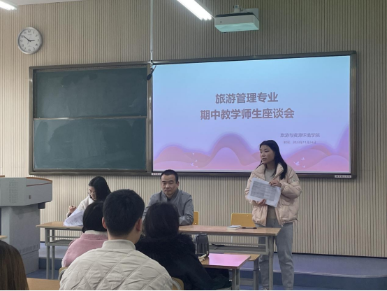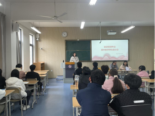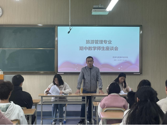 为深入了解员工的思想动态、学习和生活情况,进一步加强师生沟通,促进旅游管理国家一流专业建设和人才培养,2023年11月24日下午14:30,旅游管理专业期中教学师生座谈会在江北1号教学楼1310教室举行,座谈会由旅游管理系主任刘智兴老师主持,旅游管理专业任课教师史珊和康晓媛老师、旅游管理专业员工共计40余人参加。