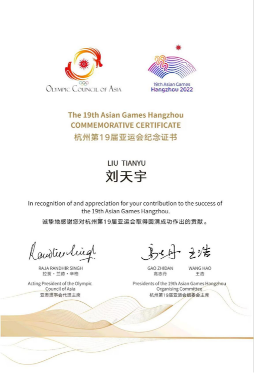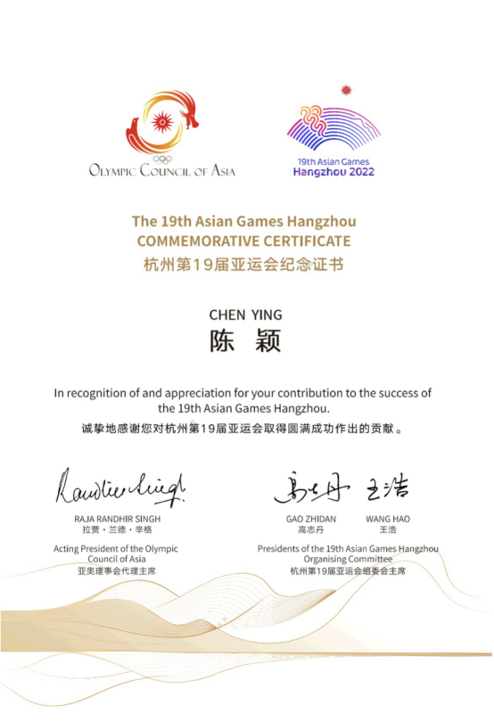 正式赛事期间,旅游管理专业员工陈颖和刘天宇主动承担工作任务,不畏劳苦,进行工程报修报单及跟进、房间铺货及撤场等方面工作,规范的着装、大方端正的态度、严谨的工作作风、敬业的工作态度、专业的接待服务,获得了杭州亚运会的“杭州第19届亚运会纪念证书”。