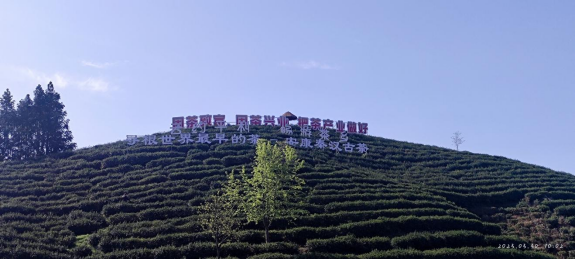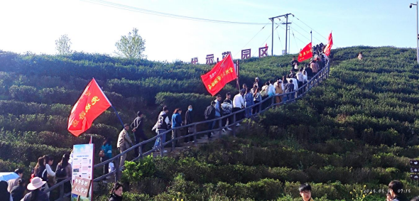 同学们在老师与导游的带领下充满向往,穿梭于茶园之间,只见蒋家坪村云雾从山间升腾而起,风景如画,满山遍野层林尽染,色彩斑斓,碧绿的茶园在薄雾和阳光的映射中若隐若现,宛如一幅泼墨山水画,同时也感受到清风徐来醉人之触与春光佛面柔韧之感。