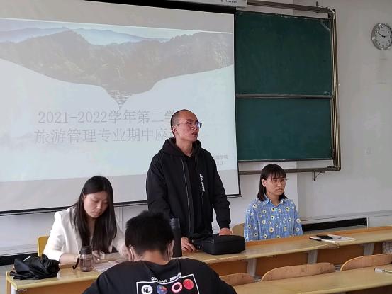 2022年4月22日下午2:30在史珊、王琦、李娜三位老师的主持下,旅游管理专业组织各年级员工代表20余人在江北教室1203开展了2021-2022年第二学期师生座谈会,目的是了解和解决开学以来到学期中本专业同学们学习和生活中的问题以及后期学习生活应该注意的事项。
